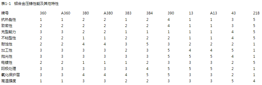 表1-1介紹了鋁合金壓鑄性能及特性,這個表有助于設計者在設計壓鑄產品時,了解所采用的壓鑄合金特性能否滿足產品要求。掌握了某種合金的特性后,在制定壓鑄工藝、模具設計、后加工及表面處理時可采取相適應的措施,來保證產品的質量。